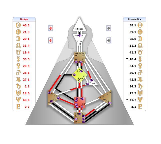 Hier links zie je een voorbeeld van een bodygraph/chart. Als je een gratis chart aanvraagt, is dit wat je krijgt. Hier zie je de centra, poorten en kanalen. Er staat genoeg online om zelf allemaal op te zoeken wat het betekent. Maar hoe makkelijk is het dat je bij Flora Lifestyle een blauwdruk of een reading kunt bestellen? Laat mij het werk voor je doen, dan kun jij je focussen op bloeien!