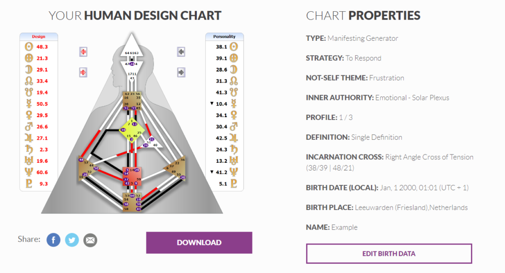 Via de button hieronder vraag jij je gratis chart aan. Dit gebeurt bij een externe site. De chart kun je downloaden, je hebt nu meteen toegang tot jouw bodygraph!